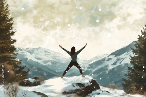 yoga, mountain, snow, winter, nature, serenity, peace, calmness, meditation, mindfulness, healthy, lifestyle, exercise, fitness, wellness, balance, harmony, freedom, inspiration, adventure, travel, landscape, scenery, outdoors, cloud, sky, digital, art, painting, illustration, woman, female, person, pose, warrior, three