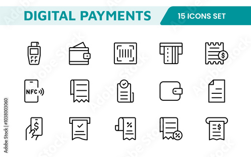 Digital Payments Icon Set. Sleek and modern icons for e-commerce, online transactions, and fintech apps, designed to enhance user interfaces and streamline payment processes.