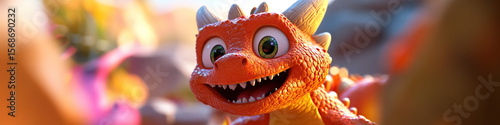 dragon, orange, cartoon, digital, render, three-dimensional, closeup, eye, grin, smiling, texture, skin, scale, horn, teeth, mouth, head, body, tail, warm, colours, background, blurred, animation, character, friendly, cute, joyful, playful, fantasy