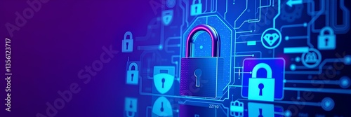 security, digital, lock, protection, cyber, technology, artwork, padlock, safety, symbol, icon, abstract, circuit, pattern, blue, purple, gradient, depth, innovation, datum, information, landscape, modern, representation, composition, importance, safeguarding, visual, challenge, solution, high-coloured, striking, central, hue, bright, tone, atmosphere, intrigue, essence, design, creativity, future, connectivity, network, encryption, privacy, awareness, integrity, trust