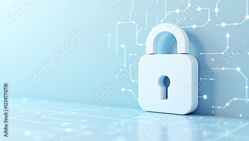 digital security concept, giant padlock icon, circuit board patterns, minimalist design, white and light blue color scheme, cybersecurity illustration, 3D render, futuristic technology