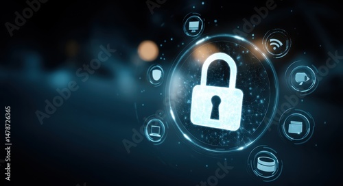 digital, security, lock, device, connected, network, technology, datum, protection, interface, graphic, illustration, symbol, abstract, design, modern, futuristic, icon, circle, light, dark, blue, white, background, overlay, element, virtual, web, cloud, communication, information, safety, safe, system, connection