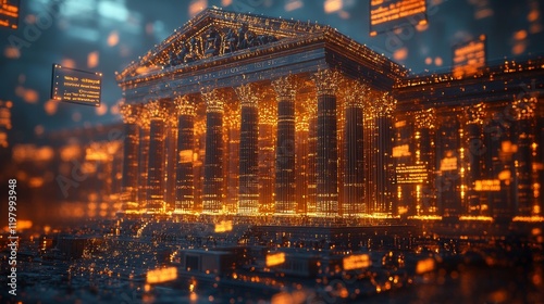 temple, architecture, digital, datum, classical, column, glowing, ancient, structure, building, three-dimensional, render, digital artwork, abstract, technology, innovation, future, modern, design, light, glow, orange, dark, line, network, information, code, science fiction, virtual, reality, illuminated, intricate, detail, aesthetic, style, image, artwork, concept, scene