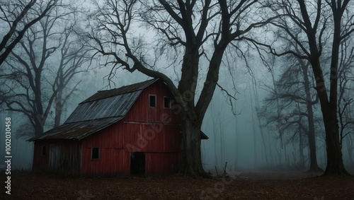 Dilapidated red barn in foggy wooded area under overcast sky, creating eerie mood