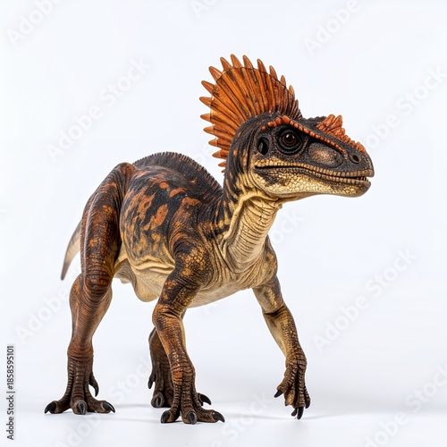 Dilophosaurus dinosaur toy figure on a pristine white background capturing prehistoric era