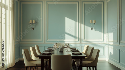 dining room with an elegant marble table and muted tones of gray and taupe,