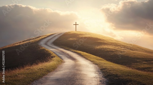 dirt road, winding road, hilltop, summit, sky, cloud, sunlight, grass, distant, landscape, rural, path, horizon, slope, golden hour, sunrise, sunset, warm light, tranquil, serene, religious, faith, christianity, simple, minimalist, overcast, soft light, texture, curve, undulating, natural light, background, empty road, field, outdoors, daytime, up high, no people, vertical, calm, quiet, peaceful, calmness, spiritual, sacred