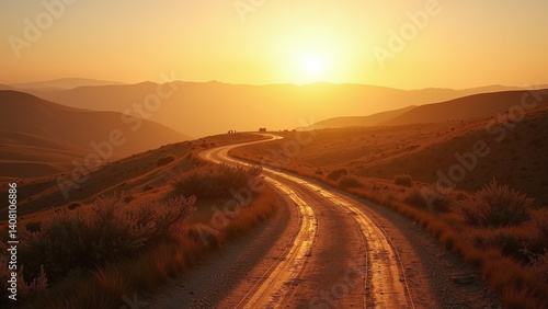dirt road, winding road, hill, mountain, sunset, golden light, orange, warm light, landscape, horizon, shrub, dry grass, curve, sky, sun, setting sun, dirt, gravel, roadside, overlook, highland, elevated, golden hour, sunlight, vista, scenery, open space, terrain, rural, remote, tranquil, natural light, no people, sun ray, hillside, dusk, evening, backlit, pastel, scenic