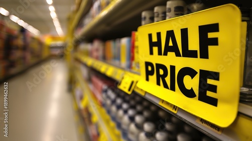 discount, signs, grocery, store, aisle, yellow, indicating, half, price, sale, shopping, retail, marketing, product, economy, consumer, promotion, clearance, bargain, offer, advertisement, signage, commercial, food, shopping cart, buyer, consumerism, deal, savings, merchant, display, inventory, shopper, sale