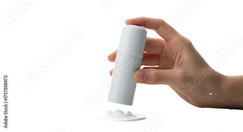 Dispensing cosmetic product with hand, minimalist design, skincare treatment.
