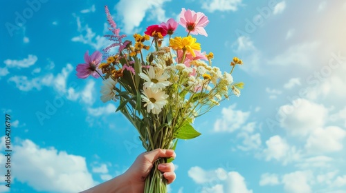 flower, hand, hold, bouquet, wild, yellow, blue, sky, gift, white, chicory, field, woman, blowball, chamomile, background, birthday, summer, green, wildflower, nature, spring, love, concept, girl, floral, beauty, colours, plant, blackboard, beautiful, congratulation, natural, day, happiness, freedom, present, holiday, romance, wildflower, narcissus, joy, journey, bright, closeup, day off, female, rest