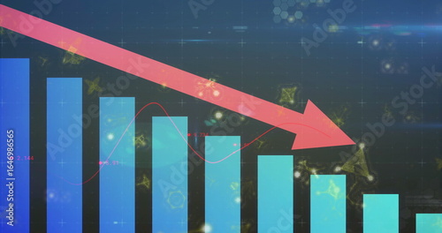 arrow, downward, red, dashboard, bar, financial, digital, interface, futuristic, gradient, blue, teal, decreasing, grid, dark, glowing, particle, gold, motif, numeric, molecular, network, high technology, chart, visualisation, slope, background, marker, floating, symbol, streak, colours, technology, abstract, pattern, display, business, statistic, progress, decayed, economy, graph
