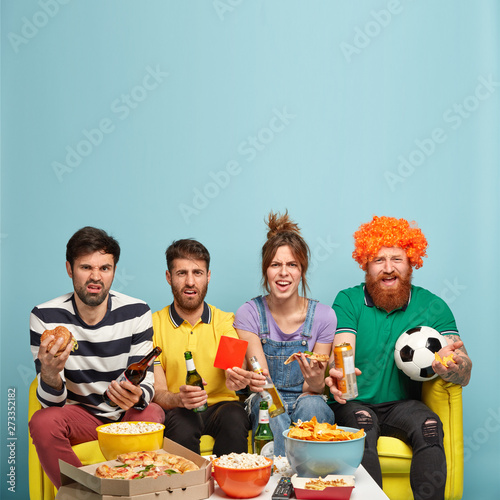 Displeased company of friends doesnt agree their favourite team received red card, watch game in dissatisfaction, eat pizza and burger with cold beer, think referee is not right. Sport fans on couch