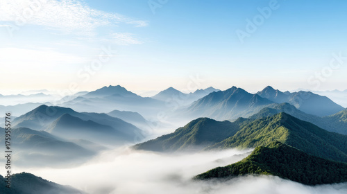 mountain, mist, landscape, serene, morning, silhouette, nature, calmness, peak, horizon, sky, green, blue, fog, scenic, beauty, elevation, travel, adventure, peaceful, environment, wilderness, sunlight, atmosphere, vista, exploration, natural, scenery, panoramic