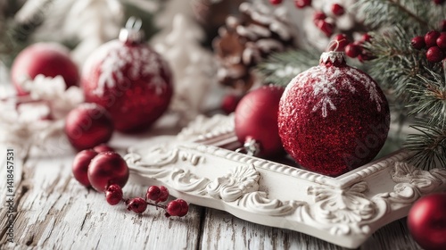 distressed, vintage, frame, shabby, worn, antique, holiday, ornament, christmas, winter, festive, decoration, white, painted, wooden, glasses, ceramic, porcelain, metal, plastic, hand-made, homemade, rustic, country, bungalow, snowflake, star, tree, ball, hanging, garland, background, still life, close, up, macro, texture, pattern