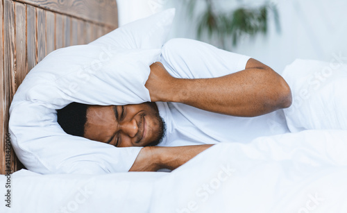 Disturbed Black Man Covering Ears With Pillow Suffering From Insomnia Lying In Bed At Home. Sleeplessness