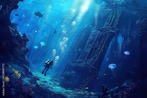 underwater, ocean, aqualung, diver, jellyfish, sunken, city, ruin, exploration, sea, diving, water, deep, sunbeam, blue, adventure, marin, travel, ancient, undersea, fantasy, mystery, glow, light, fish, coral, structure, arch, stone, aquatic, environment, discovery, scuba diving, breathtaking, silhouette, perspective, calmness, serene, dreamy, digital, illustration, artwork, concept, visual, creative, vibrant, surreal