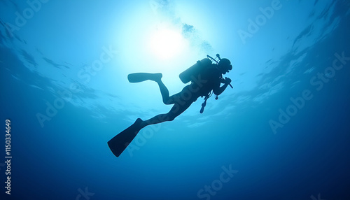 diver, diving, aqualung, underwater, ocean, sea, marin, sky, blue, silhouette, deep, depth, aquatic, marine life, coral, reef, exploration, adventure, sport, recreational, professional, blue skies, scuba diving, deep sea, underwater photography, blue ocean