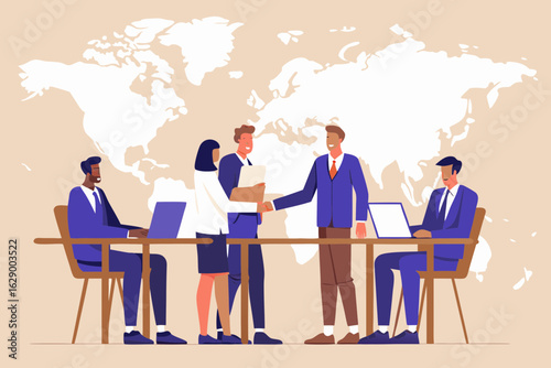 business, meeting, collaboration, teamwork, global, earth, map, handshake, agreements, partnership, professional, diversity, people, office, strategy, success, finance, corporate, international, discussion, planning, deal, communication, networking, illustration, vector, flat, design