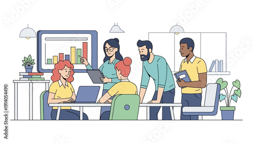 diverse business team collaborating in a modern office analyzing a data graph on screen illustrating teamwork and business strategy