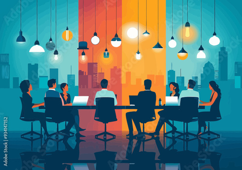 business, team, meeting, collaboration, communication, diverse, office, evening, city, skyline, modern, concept, teamwork, vector, illustration, minimalistic, professional, brainstorming, discussion, corporate, strategy, planning, people, workspace, urban, indoor, light, silhouette, group, technology, cooperation, idea, colleague, management, creative, productivity, success, leadership, development, project, design, innovation