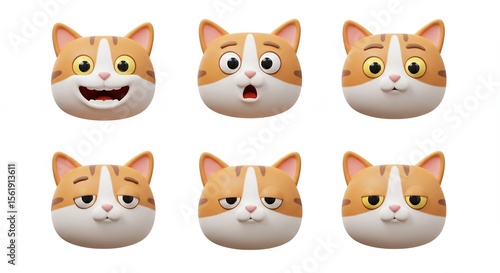 cat, ginger, orange, brown, digital, illustration, cartoon, emotion, happy, surprise, concerned, sleepy, isolated, expression, animal, pet, cute, whimsical, design, character, graphic, image, digital artwork, creative, artwork, clip art, vector, copy space, collection, set, white background