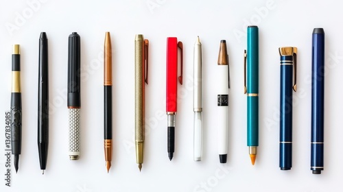 pen, crayons, marker, fountain, ball pen, ink, desk, stationery, office, education, artist, creativity, design, writing, art, craft, vignetting, calligraphy, instrument, tool, smooth, precision, stylish, professional, classic, modern, high-coloured, colours, contrast, detail, simple, elegance, functionality, arrangement, composition, background, white, workspace, inspiration, productivity, uniformity, corporate, organisation