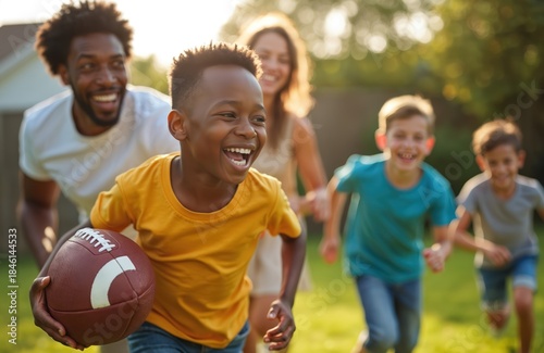 Diverse family plays football in backyard grass. Parents and kids run laughing together. Father holds ball, sons chase him joyfully. Happy active weekend fun.
