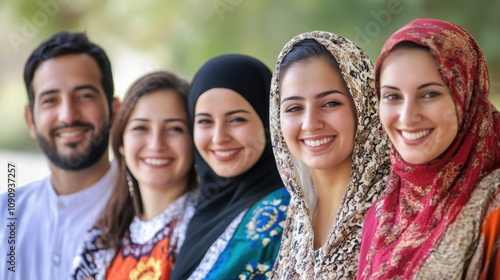 diverse group of friends from different cultural backgrounds, smiling together outdoors, unity and inclusiveness