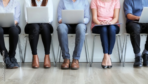 diverse, group, individual, seated, laptop, await, job, recruitment, employment, professional, background, networking, waiting, opportunity, skill, work, preparation, application, meeting, career, workspace, education, interaction, technology, accessory, woman, chair, beauty, fashion, sitting, leg, person, business, model, lady, people, dress, hair, 1, businesswoman, black, shoe, body, office