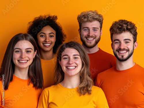 group, people, smiling, happy, diversity, young, portrait, orange, together, community, friendship, cheerful, person, youth, positive, team, teamwork, optimism, adult, caucasian, african american, woman, man, background, studio