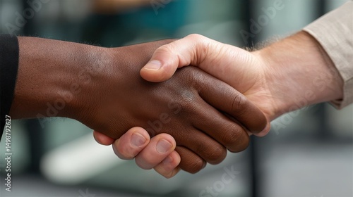 Diverse hands engage in a firm handshake symbolizing unity, agreement, partnership, and collaboration in a professional setting