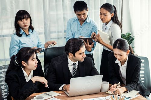 Diverse of business people from various ethnic group working in modern office environment. Productive and multi ethnic office workers engage in discussion for strategic business marketing. Meticulous