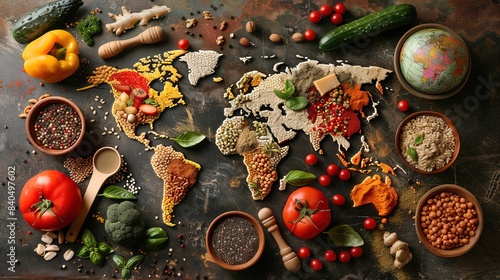 Diverse range of global cuisines. Top view of world map made of food ingredients and vegetables