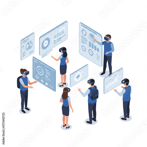 Diverse Students Collaborate on VR E-Learning Project in Isometric View.