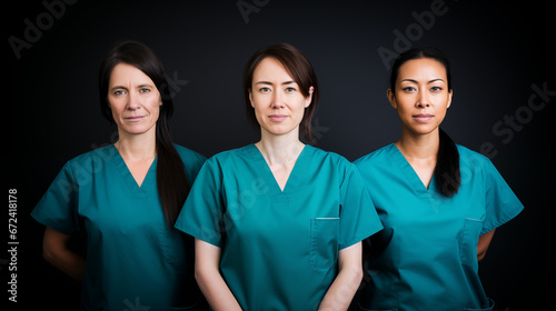 nurse, scrub, portrait, diversity, woman, health care, professional, team, uniform, medicals, staff, group, serious, doctor, dental, assistant, experienced, confidence, black background, studio shot, focused, responsible, committed, front view, colleague, cooperation, hospital, smiling, men at work, teamwork