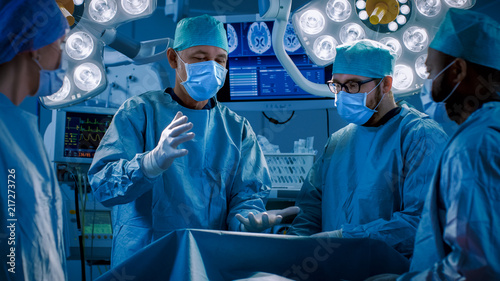 Diverse Team of Professional Doctors Performing Invasive Uses Augmented Reality Technology on a Patient in the Hospital Operating Room. Real Modern Hospital with Authentic Equipment.