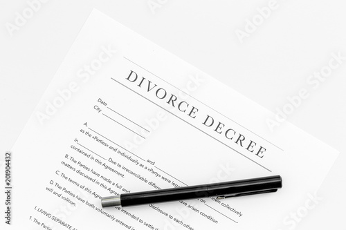 Divorce decree. Document on white backgroud top view copy space