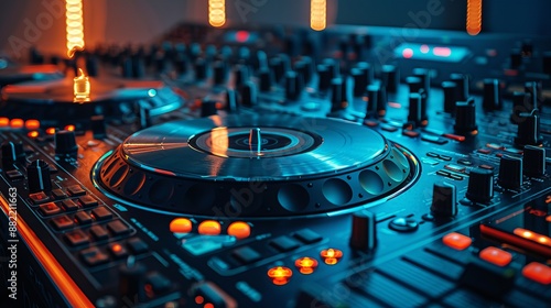 turntable, music, nightlife, club, party, audio, sound, mixing, console, control, buttons, knob, equipment, technology, audiophile, performance, entertainment, audio system, digital, electronic, detail, light, blue, orange, dark, closeup, professional, studio, mix, remix, beat, rythm, groove, track, music lover, sound engineer, phonograph