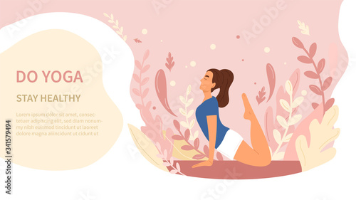 Do Yoga and Stay Healthy poster design in pink tones with a young woman working out outdoors and copy space for text, vector illustration