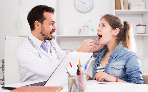 female, teenage, client, visitor, patient, male, doctor, professional, consulting, visit, painfully, throat, cold, symptom, hospital, medicine, center, room, office, indoor, children, girl, man, guy, young, adult, white, caucasian, european, 2, people, problem, disease, clinic, medicals, treatment, procedure, health, well-being, stethoscope, diagnostic, care, service, responsibility, assistance, help