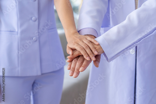 doctor and nurse doing hands stacked for support health care team to reach mission goal,collaboration together