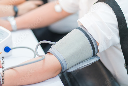 Doctor checking patient arterial blood pressure in hospital. Health care Concept