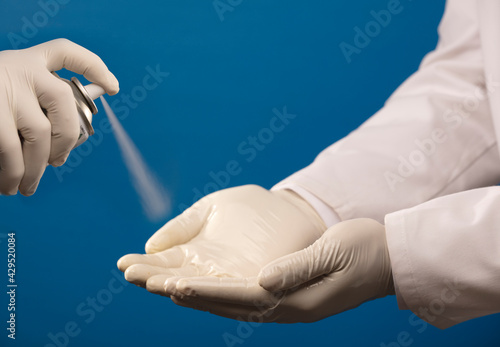 doctor clean hands with spray, hygiene in hospital, PPE standards, blue background