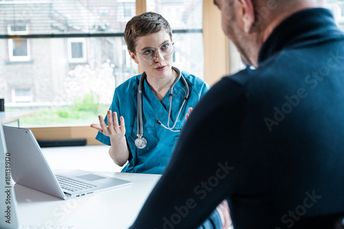 doctor, consulting, patient, clinic, office, technology, 2, people, computer, laptop, communication, senior, adult, woman, man, pair, occupation, support, caucasian, expertise, job, meeting, discussing, consultancy, care, mature, wireless, nursing, staff, advice, advising, medicals, practice, treatment, scrub, professionalism, talking, goggles, nurse, stethoscope, disease, therapy, confidence, connection, health, trust, guidance, health care