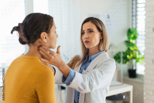 Doctor examining lymp nodes on neck of the teenage girl. Palpation of lymph nodes. Concept of preventive health care for adolescents.