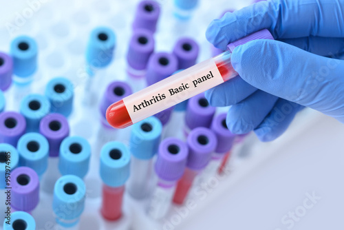 Doctor holding a test blood sample tube with Arthritis Basic Panel test on the background of medical test tubes with analyzes.