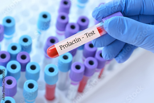 Doctor holding a test blood sample tube with Prolactin test on the background of medical test tubes with analyzes.