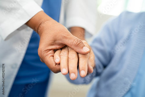 Doctor holding hand and help senior woman patient in hospital.