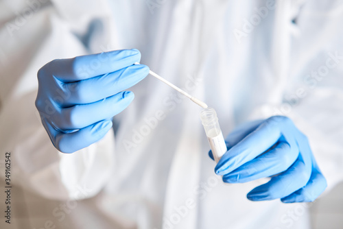 Doctor holding swab test tube for 2019-nCoV analyzing. Coronavirus test. Blue medical gloves and protective face mask for protection against covid-19 virus. Coronavirus and pandemic.